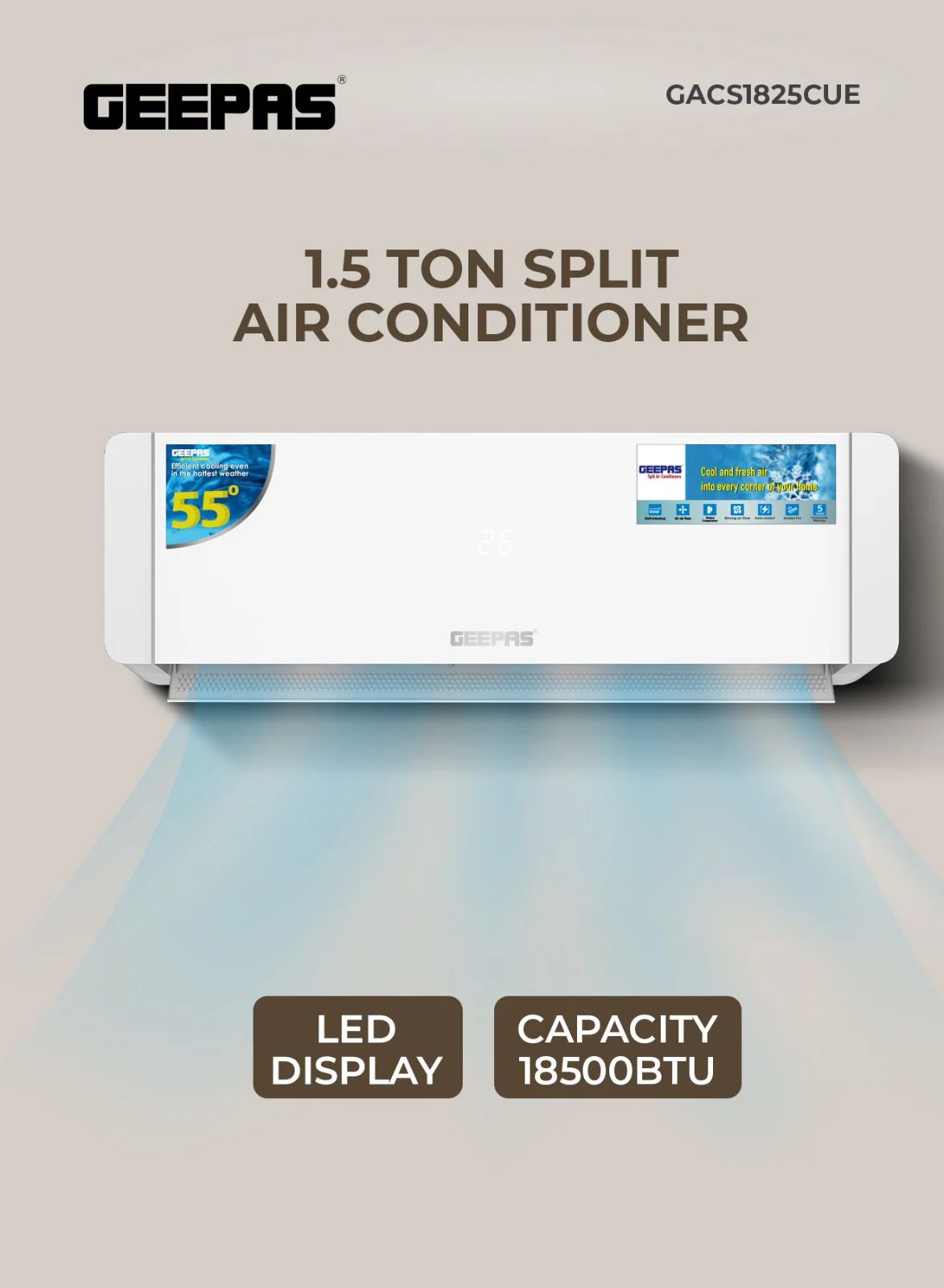 🔷Geepas 1.5 Ton Smart Split AC | GACS1825CUE | 18500 BTU, Wi-Fi, LED Display