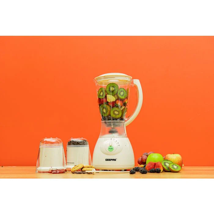 Geepas 400W | 3 in 1 Multifunctional Blender | Safety lock | Stainless Steel Blades| 4 Speed with Pulse | 1.5L Jar| Over Heat Protection | Coffee Grinder & Smoothie Maker