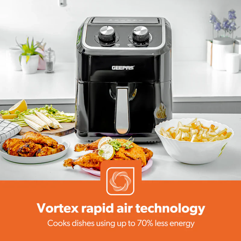 Geepas Air Fryer- GAF37528| 1600W, 5 L Capacity| Equipped with VORTX Air Frying Technology, Oil Free Cooking| Adjustable Timer and Temperature, 1-30 Minutes Timer