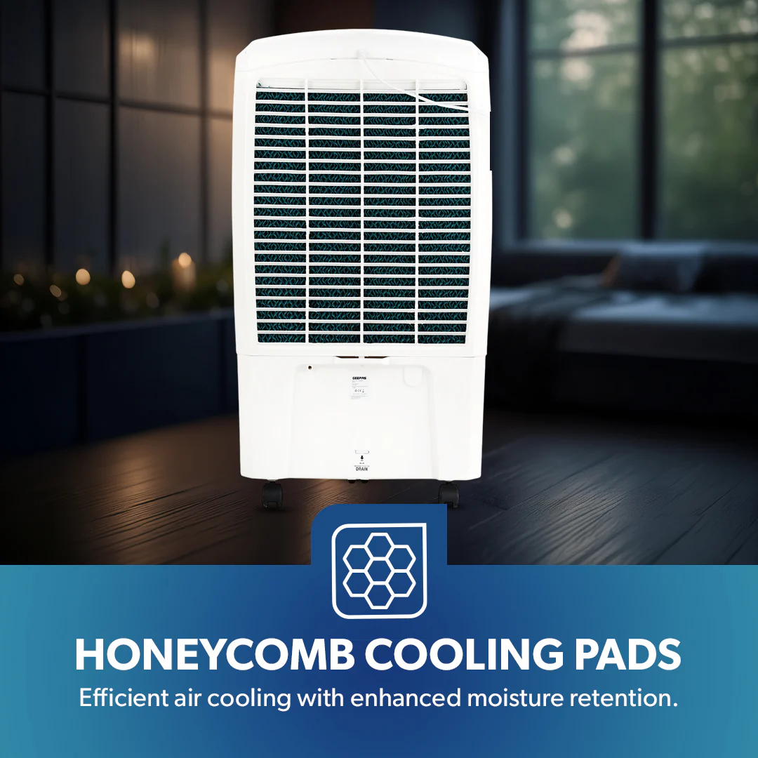Stay cool and comfortable all summer long with the Geepas GAC9602 Air Cooler, engineered for powerful yet energy-efficient performance. Featuring advanced honeycomb cooling pads, this air cooler delivers superior air distribution and effective cooling across your space. The 70-liter large water tank ensures longer cooling hours without frequent refilling, while the low 150W power consumption makes it highly economical and eco-friendly. Built with a powerful rust-proof fan and a specially designed air grill, it ensures strong air throw at body level. The multi-directional wheels offer easy portability, making it suitable for homes, offices, and shops. Designed and Made in India, the GAC9602 combines performance, durability, and affordability — backed by a 2-year warranty for complete peace of mind.