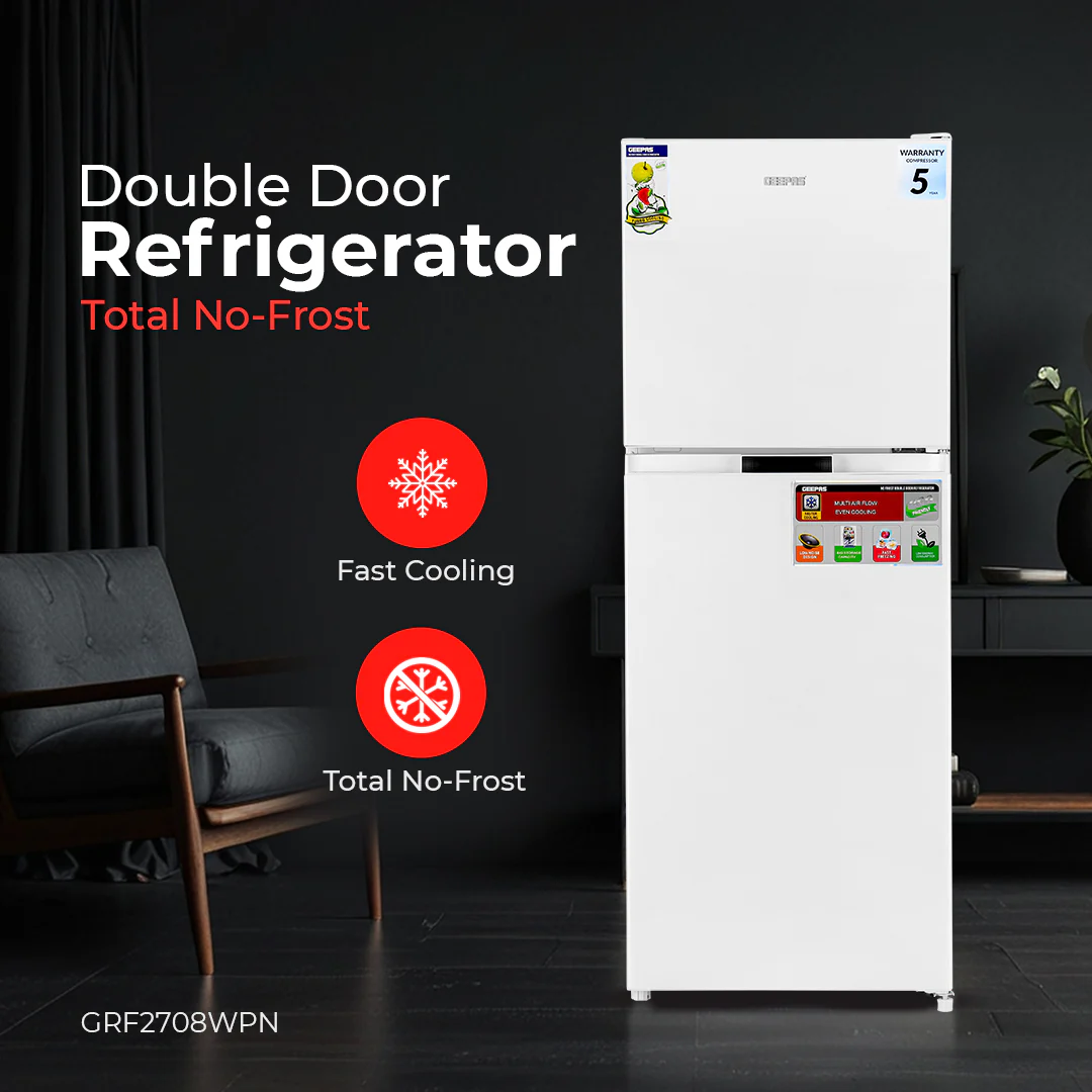 Geepas Double Door Total No-Frost Refrigerator- GRF2708WPN-U/ 270L Gross/ 200L Net Capacity, Quick Cooling, Low Noise Operation/ Equipped with Glass Shelves, Chrome Bottle Holder