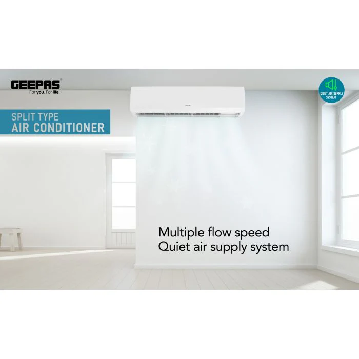 Experience powerful and consistent cooling with the Geepas GACS2468TCU 2.0 Ton Split Type Air Conditioner, engineered for energy-efficient performance and all-day comfort. Designed with a 24000 BTU cooling capacity, this air conditioner ensures quick and uniform cooling for large spaces such as living rooms, offices, and commercial areas.Featuring a Turbo Cooling function for instant temperature drop and multiple airflow speeds, it provides customized comfort in any environment. The Quiet Air Supply System ensures silent operation, while the LED display offers easy control and visibility of settings.With a washable air filter for clean airflow and auto restart functionality to resume operation after power cuts, this unit combines convenience, performance, and reliability. Stylish in design and durable in build, the Geepas Split AC guarantees long-lasting cooling comfort.