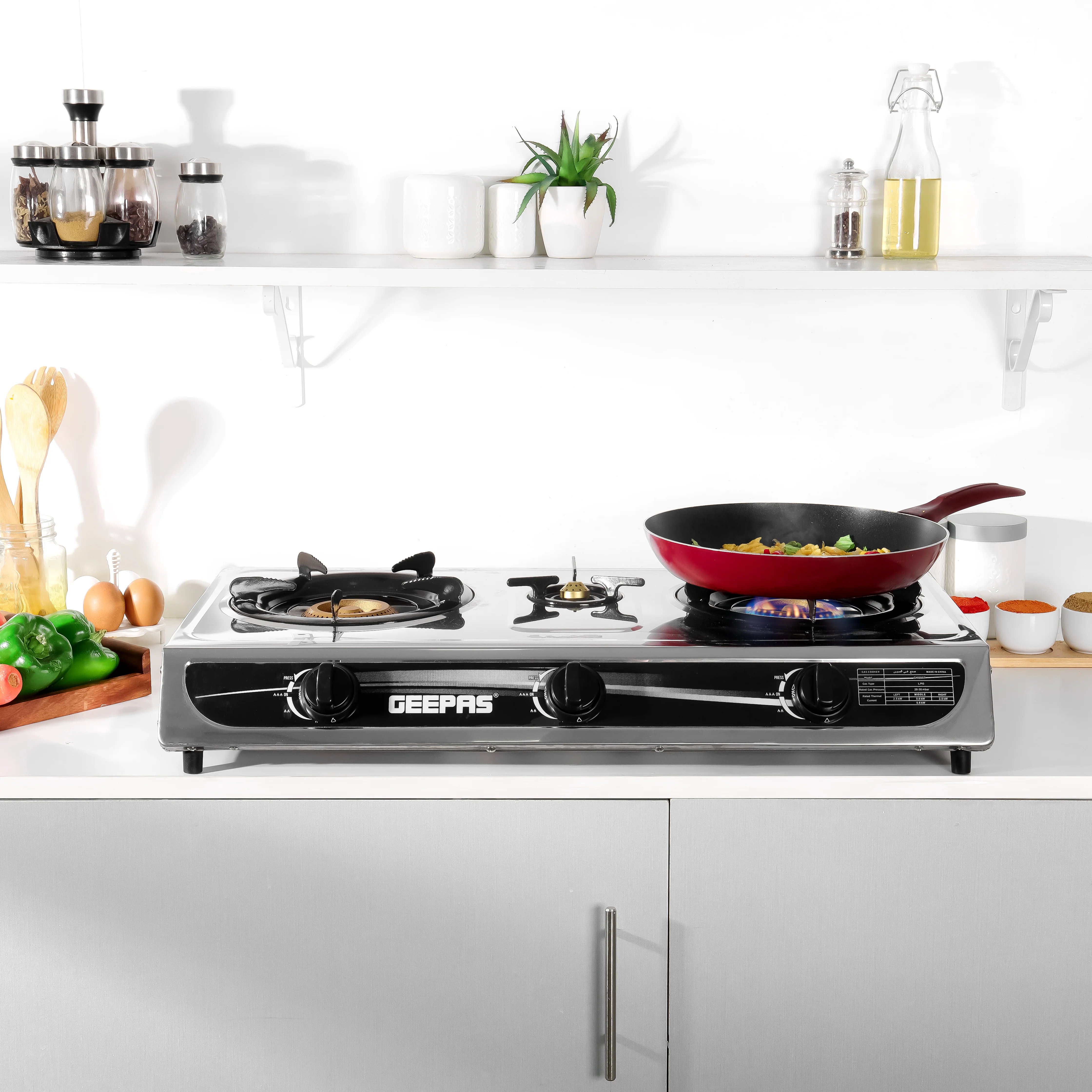 🔷Geepas GK6857 Triple Burner Gas Cooker | Stainless Steel, Auto Ignition, 5.60kW