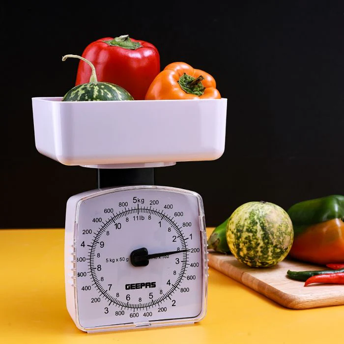 Geepas GKS46512 Kitchen Scale | 5kg Capacity Mechanical Weighing Scale | Durable ABS Body| Easy-to-Clean PS Tray| Easy-to-Read Dial| Compact Design| 2 Years Warranty