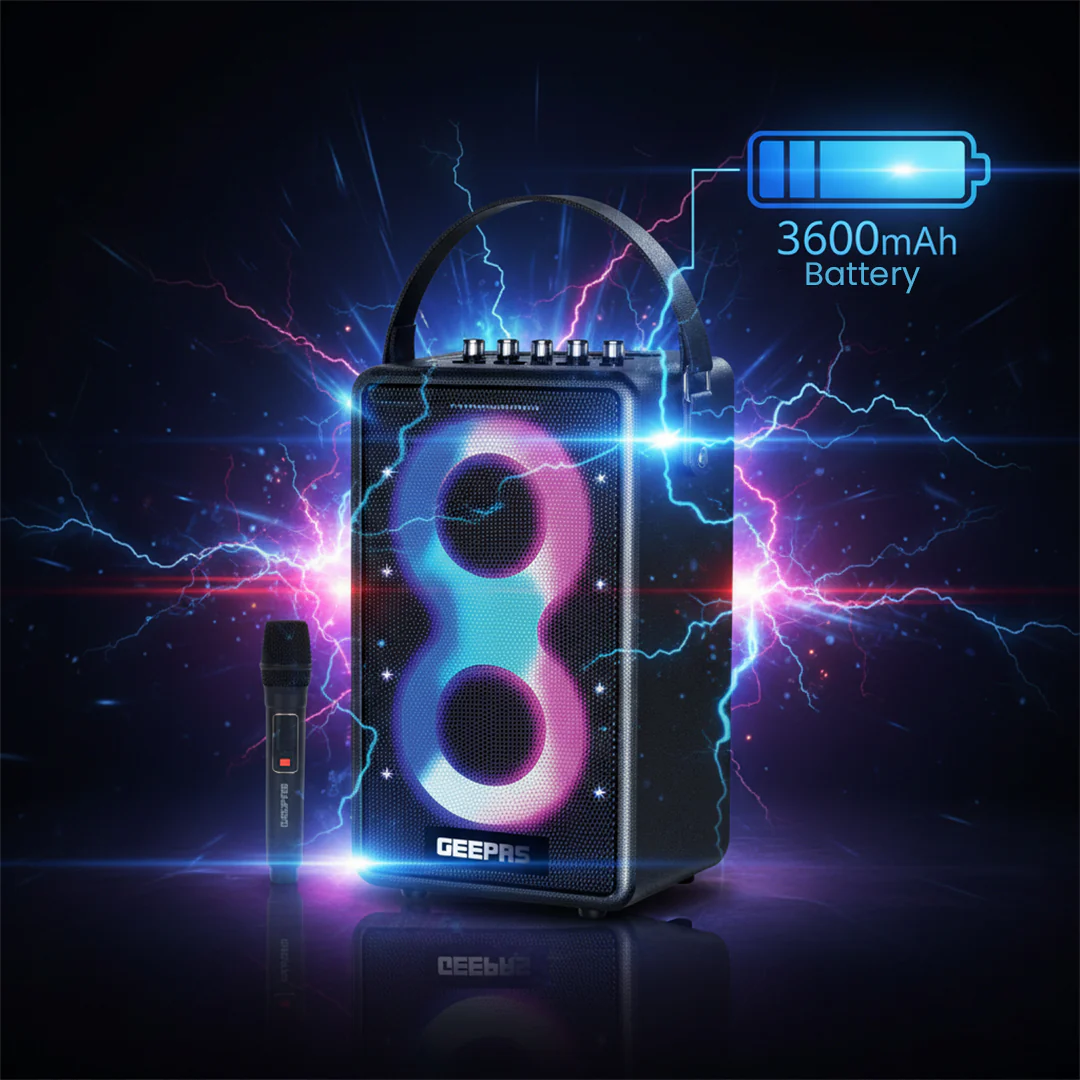 Bring your music and voice to life with the Geepas GMS11202 Bluetooth Speaker. Designed for parties, events, and karaoke nights, this speaker delivers a mighty 70W RMS output and up to 5â6 hours of continuous playback. The included UHF wireless microphone ensures crystal-clear, stable voice transmission for hassle-free singing or public speaking. Multiple connectivity optionsâBluetooth, TF, AUX, USB, Micro SD, and MIC inputâlet you play audio from virtually any source. With a massive 7200mAh rechargeable battery, Type-C fast charging, and dynamic RGB lighting effects, the GMS11202 is the perfect choice for portable entertainment.