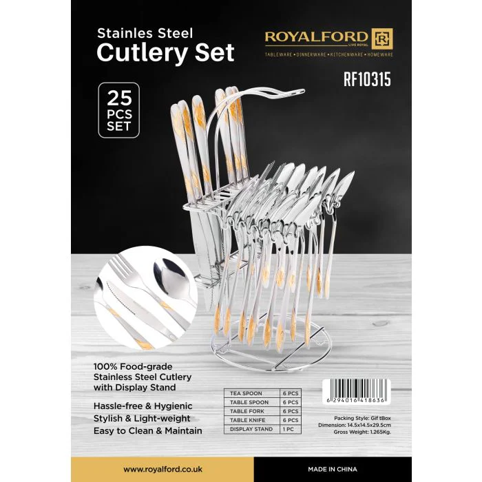 Royalford 25-Piece Stainless Steel Cutlery Set with Display Stand- RF10315| Includes 6 Teaspoons, 6 Tablespoons, 6 Table Forks, 6 Table Knives and a Stand| 100% Food-Grade, Light-Weight and Stylish| Suitable for Dining Table